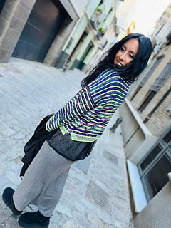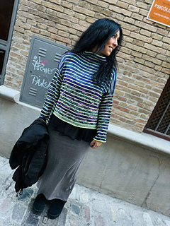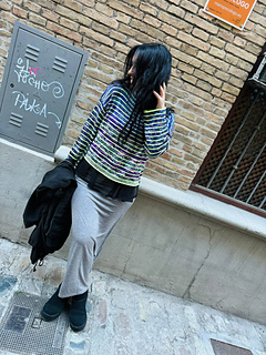 Este jersey se comienza por el cuello y posteriormente iremos tejiendo el cuerpo sin hacer ninguna costura. Por último, se recogerán los puntos de las mangas.