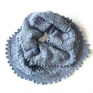 The finished cowl measures 12 1/2” deep, with 21” circumference at the top and 24” circumference at bottom, after blocking.