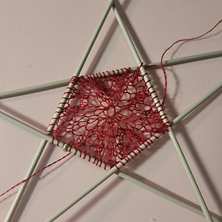 It is worked in Shetland Lace, but because you knit in the round, it ends up as stockinette.