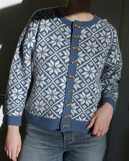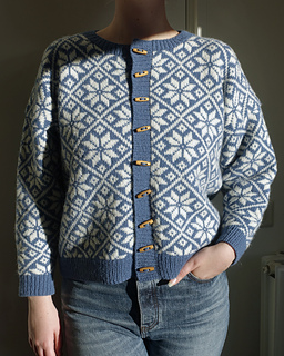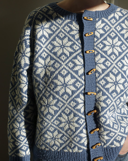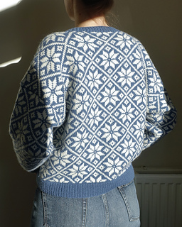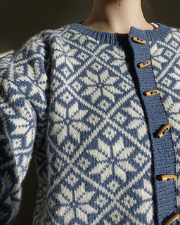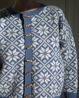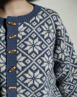 The Kiruna Cardigan is an all-over stranded colourwork cardigan, with an 80s inspired oversized fit. The pattern is calculated to have around 30 cm of positive ease, with large sleeves to complement the silhouette. The entire cardigan is knitted in the round and uses steeking to make that possible. The body is worked bottom-up and the sleeves are worked top-down.