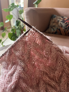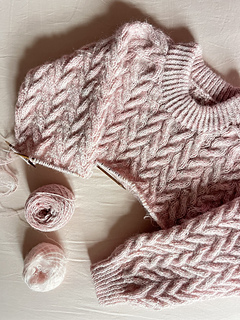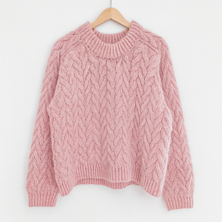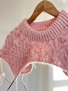 Stitches are picked up along the armhole opening, incorporating the saddle-shoulder section into the sleeve so the cable pattern can continue down the sleeve. The sleeve is shaped with decreases along the underside and finished with a twisted rib cuff. Finally, stitches are picked up along the neckline, which is worked in twisted rib, folded double, and attached on the wrong side.