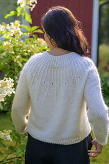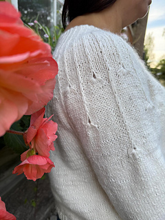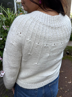 The Linnea Sweater is a single-colored, top-down yoke sweater featuring a delicate floral texture.