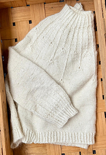 The sweater is worked in DK-weight merino wool or wool yarn. For a softer and slightly fuller result, you can hold a strand of thin mohair together with the main yarn.