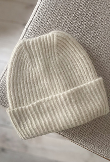 The Mayla hat is a cozy, soft hat with a ribbed pattern. The knit stitch ribs on the right side are worked through the back loop, which gives the hat additional structure. As the purl stitches are worked normally through the front loop, the hat still knits up very quickly.