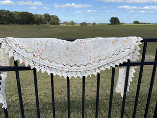 This shallow crescent shawl is worked from one end to the other. It consists of four sections: the top edge, stockinette stitch center section, lace insert section, and a lace edging. The shawl begins fairly narrow at one end and the crescent shape increases for the first half as increases are made in the center section. Work continues without increases for one chart repeat, and then decreases in the center section until back to the original number of stitches.