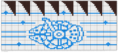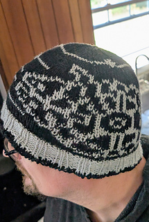 Pattern is currently just the double knit chart used to make this hat. A fully written out one is still being made. To match, just add one inch of double knit ribbing below the start of the chart. All decreases shown are ssk on right side; p2tog on wrong side.