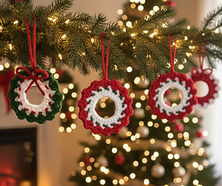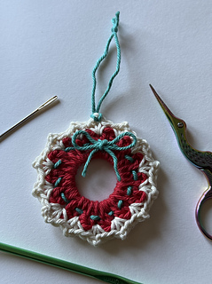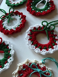 These delightful little wreaths work up quickly and look absolutely beautiful hanging on the Christmas tree. You can make a whole set as thoughtful handmade gifts for family and friends and even personalise each one. Add tiny beads or sequins to give them a festive sparkle