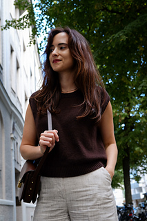 This slipover has a straight cut and a cropped, slightly loose fit, with about 5-10 cm (2-4”) positive ease at the bust. A round neckline and delicate edges in twisted rib give this design an understated elegant look. Knit in the recommended yarn, it’s incredibly soft – like a mochi! – lightweight and thermoregulating, perfect for almost any season. Layer it over a light shirt or – my personal preference! – wear it directly over the skin for maximum indulgence.
