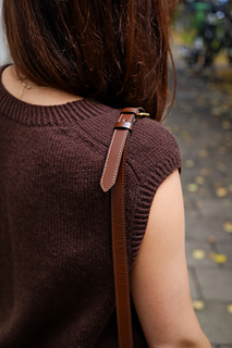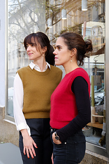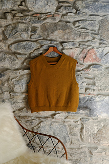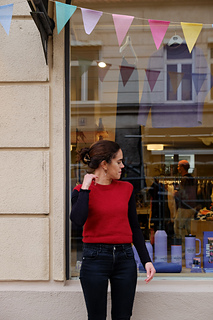 This garment is knit top-down in one piece, both flat and in the round, in stockinette stitch. The work starts at the top of the neckline with German short rows and a contiguous saddle shoulder construction with faux seams. After finishing the shoulder, the front and back pieces are first worked separately, and then joined to work the body in the round. The body is finished with a hem in twisted rib. The neckline and the armhole edges are worked in twisted rib from the corresponding edge.