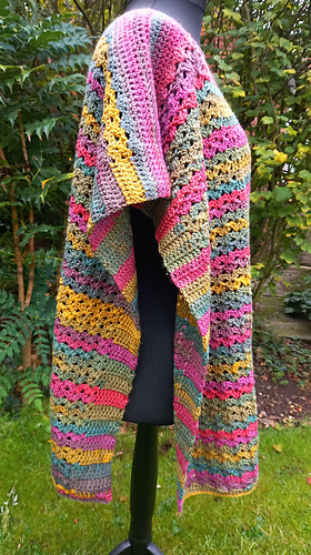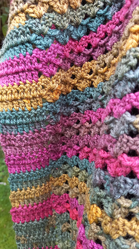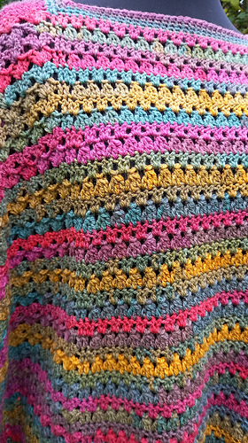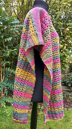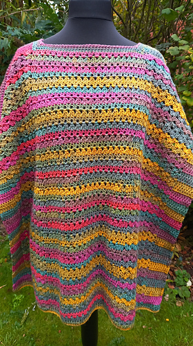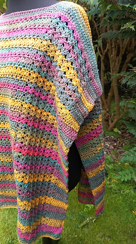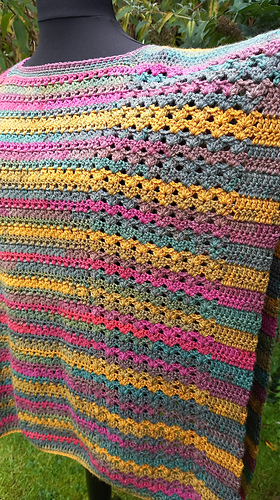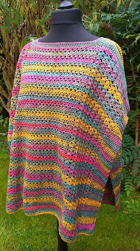 The Moorland Poncho is a generous, easy-to-wear layer made from two large rectangles with gentle shoulder shaping, joined neatly at the seams. A simple neck border, worked in rounds, completes the piece. Designed in DK/light worsted yarn with a variegated colourway, it creates beautiful natural stripes without the need for extra effort. The fabric is worked in treble crochet (US double crochet), alternating between classic stitches, V-stitches, and joined groups for added texture. With a straightforward two-row repeat, the length is easily adjustable to suit your style. The pattern is written in English using UK crochet terms.