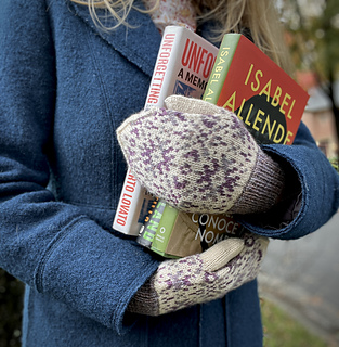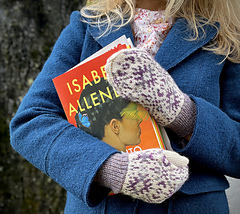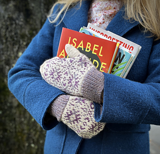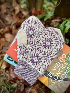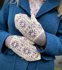 CONSTRUCTION: Inspired by the chaska motif used in traditional Andean textiles, these fair isle mittens are decorated with 2 distinct star shapes worked in shades of a single color over a contrast color background. An afterthought thumb allows the knitter to work continuously in the round without breaking stride and can be worked in a single color to match the ribbed cuff.
