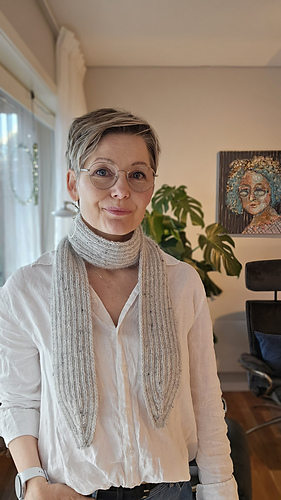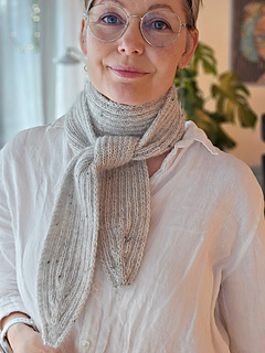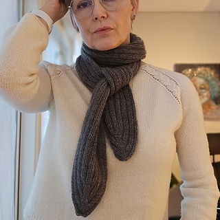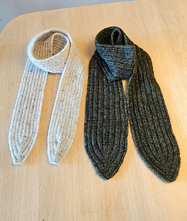 Nordvesten skjerf er et stilrent design som starter med få masker og økes gradvis ut til full bredde i et klassisk 2x2 ribbmønster, før det avsluttes med fellinger som speiler begynnelsen.