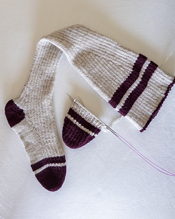 Inspired by Harry Nyquist’s work on sampling rates and aliasing, these socks use a double gusset to gradually shift the look of self-striping yarn.