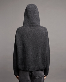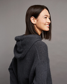 The oversized pullover with hood and dropped shoulders is worked entirely double stranded and top down in one piece, starting at the accentuated shoulder line at the upper back.