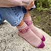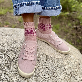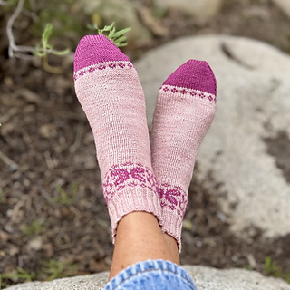 DESCRIPTION: October is the month for knitting pink projects to raise awareness for the early detection and treatment of breast cancer. PinkTOEber is when we knit pink socks for this important cause. This top-down design features a feminine colorwork band of butterflies and awareness ribbons on the leg, and another cute little touch of colorwork before the rounded toe. This charted design is written for four widths, so there’s a perfect size for anyone who would like to spread the pink word!