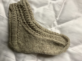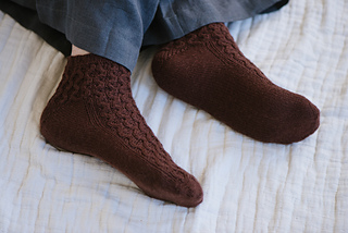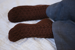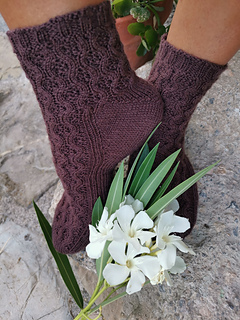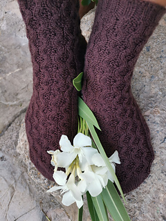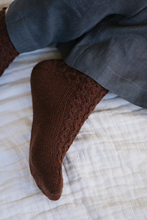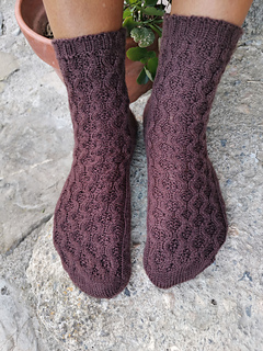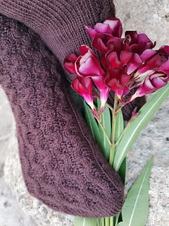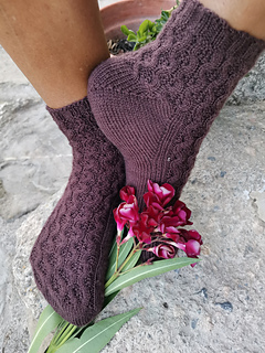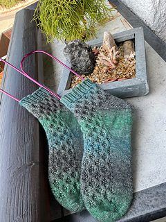 These fingering weight socks are knit toe up with a Fleegle heel. Pino pattern decorates the instep and leg. Sewn bind off finishes the cuff. The instructions are written for the Magic Loop method.