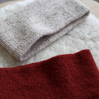 The Beige melange Plain Headband: Peruvian Highland Wool from Filcolana (col. 977, beige), held together with Soft Fine from Isager Garn (col E6S, dark beige).