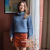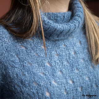 Modèle top-down tricoté en Kid Mohair (90% super kid mohair, 10% polyamide) en jersey et côtes 1/1 pour les bordures. Les jours sont créés par des jetés doubles. Coupe droite légèrement ample, emmanchures raglan, avec manches resserrées aux poignets.