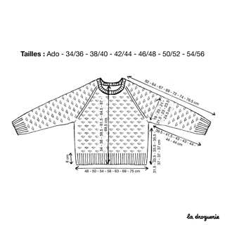 Tailles : Ado - 34/36 - 38/40 - 42/44 - 46/48 - 50/52 - 54/56 (aisance conseillée +18 cm).