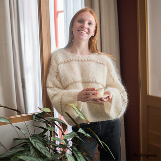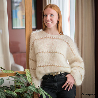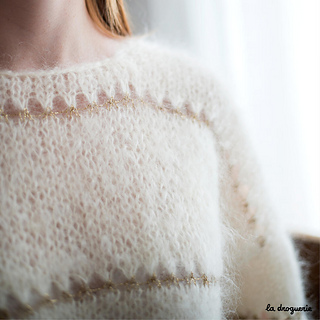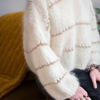 Modèle top-down tricoté en rond, en Kid Mohair (90% super kid mohair, 10% polyamide) en jersey et côtes 1/1 pour les bordures. Coupe légèrement resserrée pour un effet boule, forme loose, aux épaules tombantes. Le modèle est composé de larges bandes alternées de rayures fines brillantes en Etincelles. On choisit de tricoter les bandes en plusieurs couleurs ou en uni.