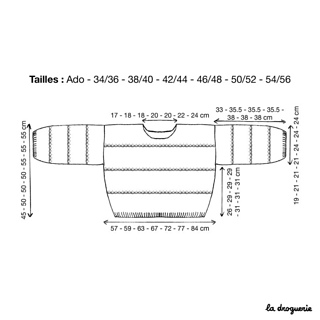 Tailles : Ado - 34/36 - 38/40 - 42/44 - 46/48 - 50/52 - 54/56 (aisance conseillée +36 cm).