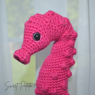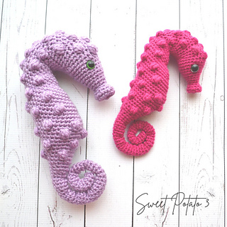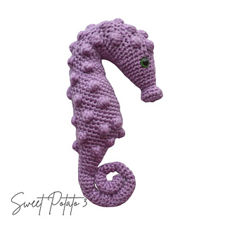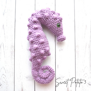 This crochet pattern comes with complete instructions for this adorable Pygmy Seahorse Stuffy. My favorite part about making this pattern is that it is crocheted as one piece! That is right, no sewing involved! Also, the pattern can be made in different yarn weights. The purple sample was made in worsted (#4) weight yarn and is 9 inches tall. The pink sample was made in light (#3) weight yarn and is 7” tall. This little seahorse is sure to be very loved!