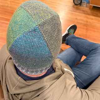 Quadform features bold color blocks and an interesting construction. It begins in the round with a ribbed brim and then shifts flat for the body using the intarsia technique. Four contrasting sections create a geometric look, making it a great project for trying intarsia in a manageable way.
