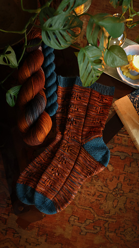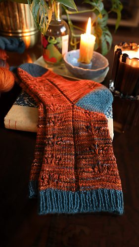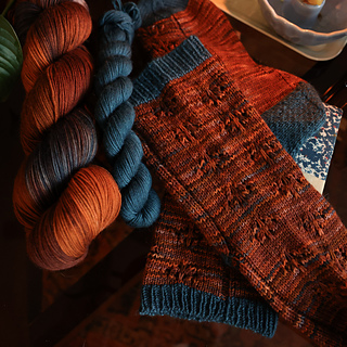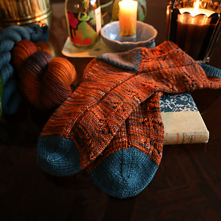 The Quietstep Socks are a gentle lace design inspired by drifting leaves and the hush of autumn days. Catch them in the light and the motif shifts—sometimes a maple leaf, sometimes a small acorn.