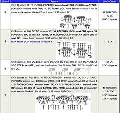 In this pattern, a variety of crochet items are used, from DC and TC and DTR to popcorn and cluster and mixed and multiple textures.