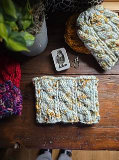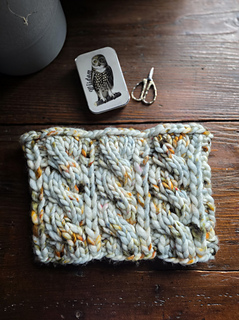 This cowl features slipped stitches and easy cables, knit on big needles in the round. The pattern is written for one size but can easily be made taller or wider.
