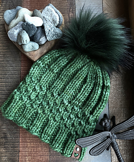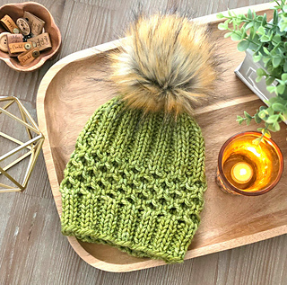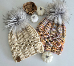 Pattern is for a one-size-fits-most unisex beanie with single brim that knits up in a couple of hours for super bulky and not much longer for bulky. Pattern is knit in the round from the bottom up with a 4-stitch repeat over 4 rounds creating the honeycomb section. Make each item unique by adding contrasting color for the band section or even different colors for brim, band and remainder of hat!