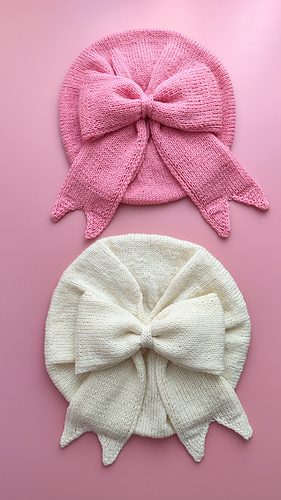 La boina se teje desde abajo hacia arriba en redondo, el lazo se teje de forma plana y con costuras.