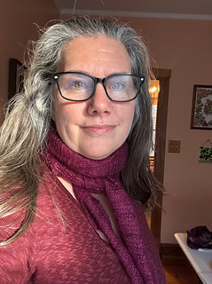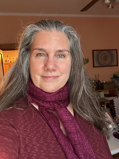 A parallelogram-shaped scarf using a combination of garter stitch, vertical trellis stitch, and veil stitch.