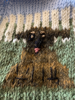 This charming hat depicts a dog on a white fenced green lawn. with a blue sky above. Just knit the picture graph.