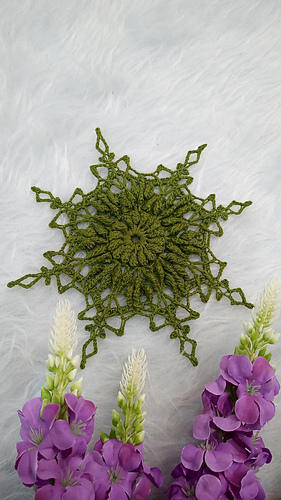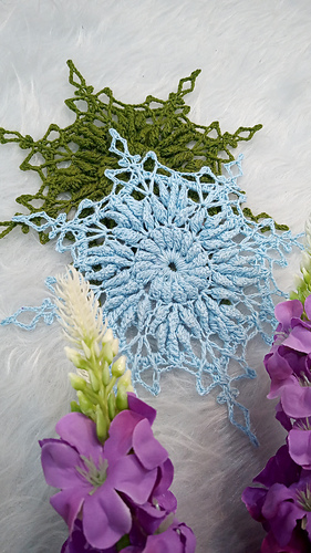 The pattern consists of 8 rounds. Finished piece will be about 15 cm in diameter from point to point after blocking.