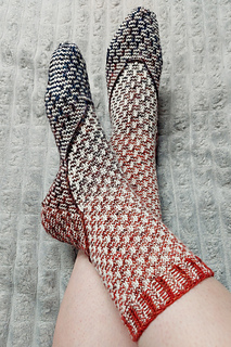 The technique is slipped sts in two colors and the colors are reversed on the heel and the sole and separated from the leg and the instep by a braid worked as a vikkel braid on the horizontal part and a slipped stitch or a little cable around.