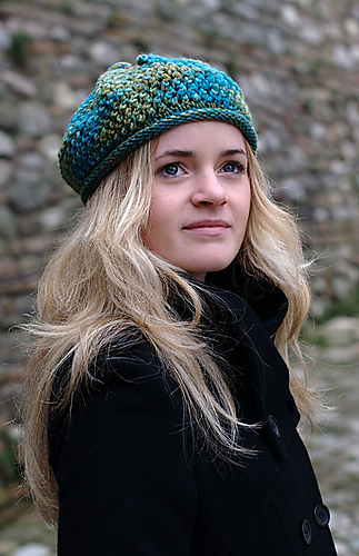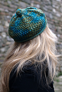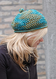 The knitted bobble is optional, and the Hat can be left unblocked as shown for a gentle cap, or blocked out to open the lace for a beret finish.