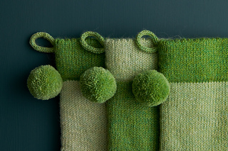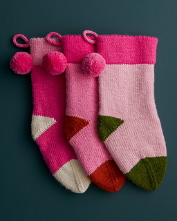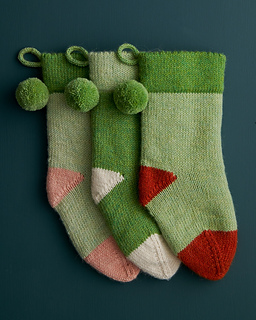 This is enough yarn for at 3 solid stockings (or up to 5, if you get creative with stripes!). To make 3 as shown, use a different shade of Nine-Note for each Cuff, Body, and Pom Pom + Hanging Loop, and 1 skein of Note for all the Heels + Toes (we explain how in the pattern). Or, do like we did, and use a few different colors of Note for variety and holiday cheer!