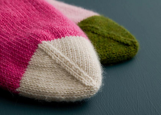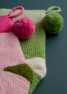 • Contrast Color (Heel + Toe): 1 skein of Purl Soho’s Note, 80% extra fine merino wool and 20% baby alpaca yarn. Each skein of this light worsted/dk-weight yarn is 200 yards/ 100 grams; approximately 30 yards required per stocking. We used Kiln Red and Heirloom White with both colors bundles; Fresh Pickle with the Dragon Fruit bundle; and Pink Sunrise with the Apple bundle.