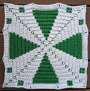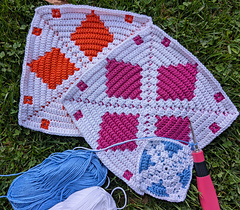 Die Decke besteht aus 7 verschiedenen Granny Square Muster in der Overlay Häkeltechnik