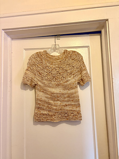 This pullover has been worked top down in the round and begins with a few short rows to elevate the back neck. The simple lace pattern is worked, followed with stockinette down to the underarms, at which point the sleeve stitches are placed on hold. Lace stitches are placed at the hem and sleeve cuffs. The lace pattern stitches instructions are provided in both chart and written formats.