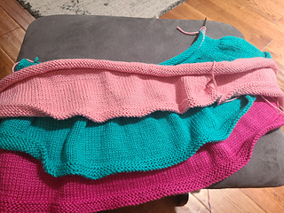 The frills and body are knit flat and joined at the sleeves to knit the yoke in the round.