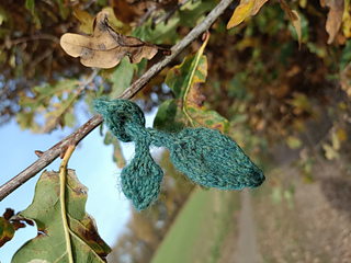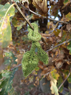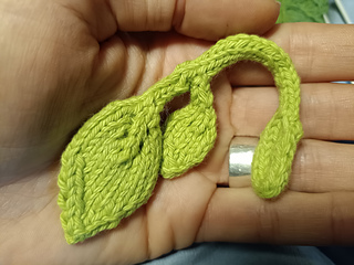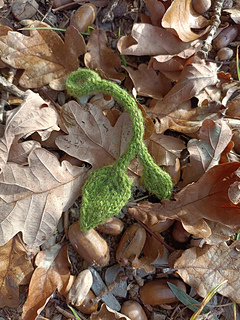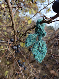 The leaves you see in the photos are knitted with sock yarn and 2,5mm needles. That way the leaves and all are about 12cm long. But really you could use any yarn and the corresponding needles, that will affect the size though.