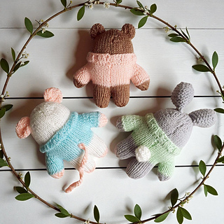 Teddy Boo, Mouse, and Bunny Boo are the best of friends—their cheeky little faces peeking out from their cosy sweaters are sure to make you smile!