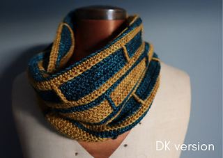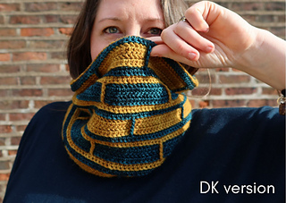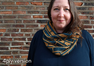 The cowl is worked flat in rows, and sewn together after blocking to create a cowl. Yarns are carried up the side, so there are only four ends to weave in.