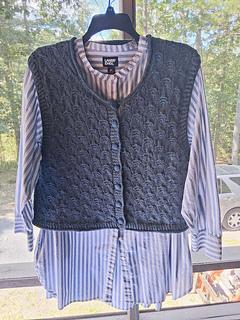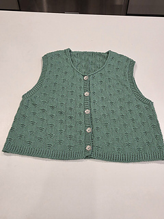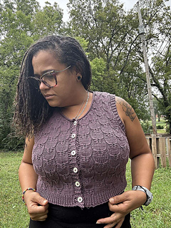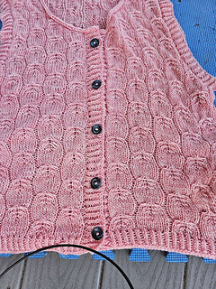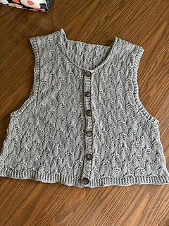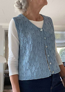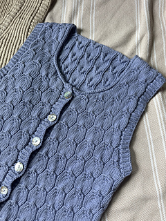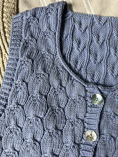 The Pearla Vest is a cabled vest featuring “horseshoe crab shapes“ made from simple cables throughout. It begins at the back of the neck, a chart is followed to increase the width of the shoulders and then worked back and forth to shape the back of the armholes. The front chest panels are picked up from each shoulder and worked individually until the neckline is shaped and joined. The front chest panel is worked back and forth to shape the front of the armholes. Once completed, the front and back panels are joined and worked back and forth until the length is completed. The vest is finished with a ribbed hem, armholes and button band with a simple applied i-cord neckline.
