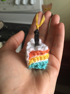 Row 5 (ruffles), top of cake: ch 2, in back loop only, sl st in 1st sc, {ch 2, sl st in next st in back loop only} 4 times. Leave a long tail for sewing, fasten off.