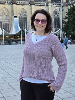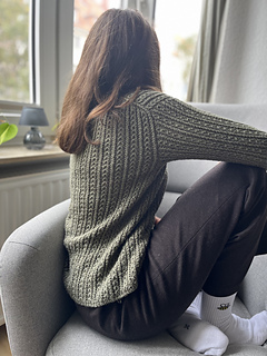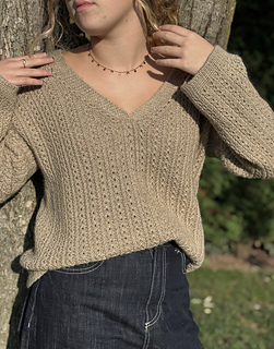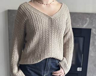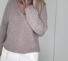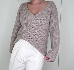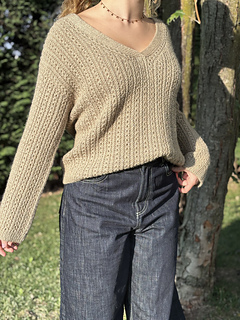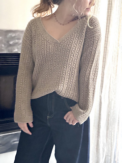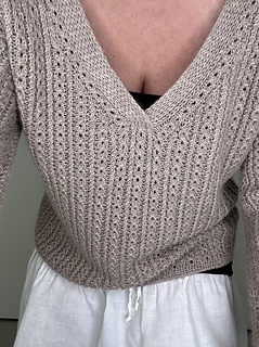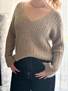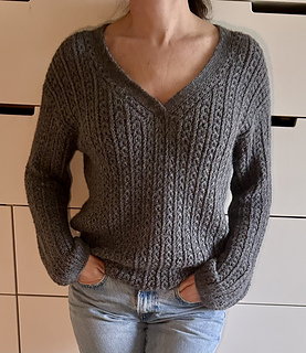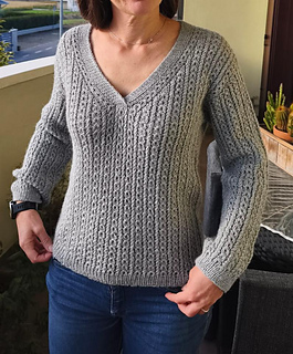 Le maglie delle spalle vengono quindi riprese e lavorate in piano una alla volta, raggiunta la profondità dello scollo a V i due davanti sono uniti e il davanti è lavorato in piano fino allo scalfo. A questo punto il davanti e il dietro vengono uniti per formare il corpo che viene lavorato in tondo in pattern fino al bordo.