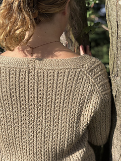 l maglione TiticHaya si lavora dall’alto verso il basso, senza cuciture. Si inizia dal bordo dietro del collo, lavorato in piano con aumenti per seguire la linea delle spalle. Si riprendono quindi le maglie del collo e si prosegue il dietro in piano fino allo scalfo.