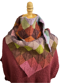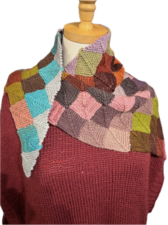 Patterns that appear to be very complex and are, in reality, very simple have always intrigued me. The TURNING SQUARES SHAWLS is just such a pattern. Simple squares that are worked over a few stitches to create a “square” which are added onto one by one to create the finished shape. By using a variety of yarns with different colors and textures, the entire garment can change with your whim. Likewise, the size of the finished project is yours to determine…make it large or small…a scarf, a shawlette, or a full-fledged shawl, it’s up to you.